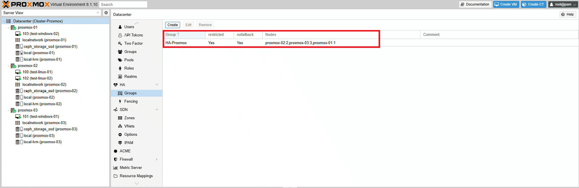 Assegnare un nome al gruppo (HA-proxmox) quindi selezionare i tre nodi Proxmox e impostare una priorità.