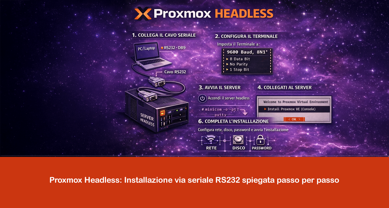 In questo articolo vedremo come installare Proxmox via seriale passo dopo passo, partendo dalla preparazione dell’installer fino alla configurazione corretta del bootloader e dell’accesso iniziale al sistema.