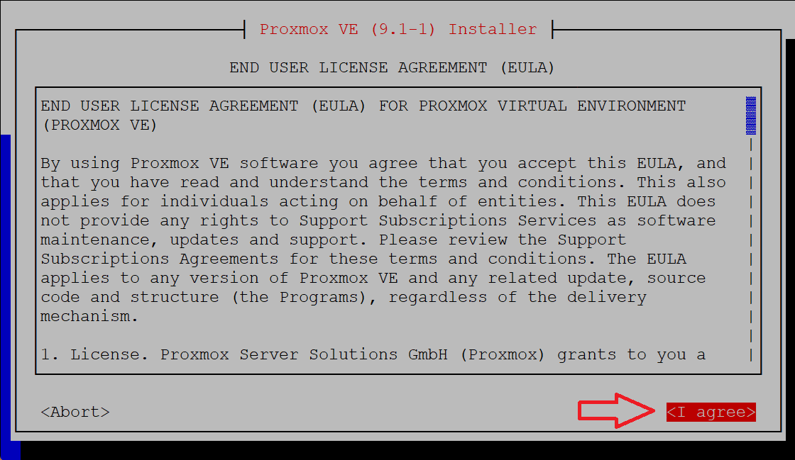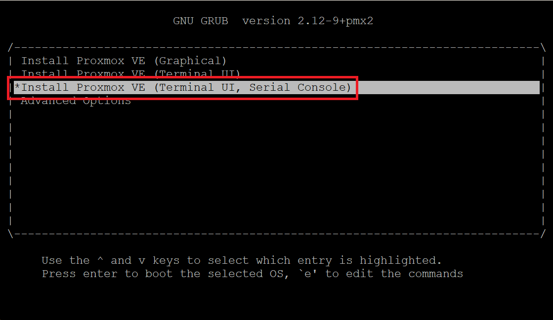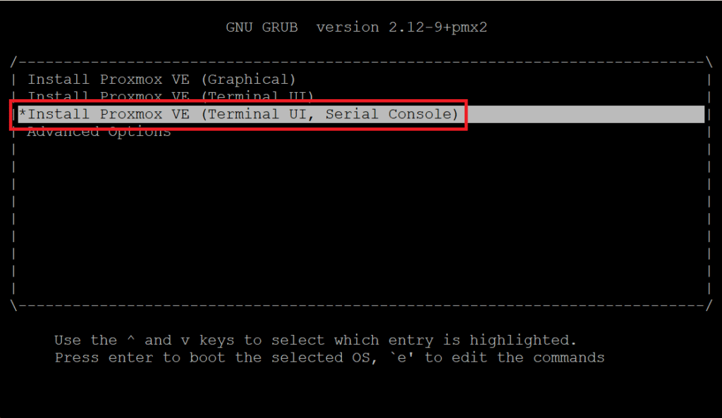 Selezionare l’opzione Install Proxmox VE (Terminal UI, Serial Console) quindi Invio