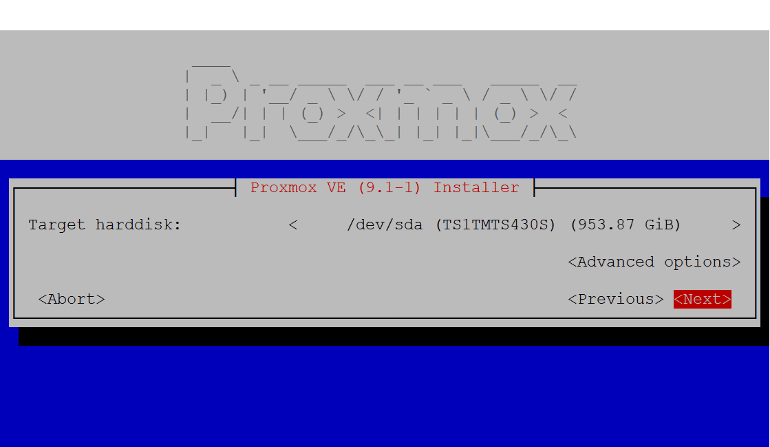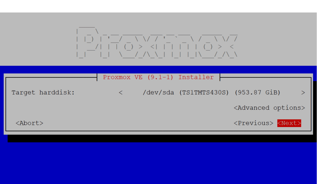Selezionare il disco dove si intende installare Proxmox quindi cliccare Next